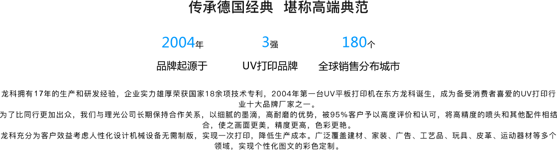 東方龍科是一家通過國家CE認證的平板打印機生產廠家,目前已取得多項國家認證的知識產權和專業認證,及8個單機的歐盟出口CE認證。并利用先進技術,使整個生產流程簡單、準確、安全、迅速,該生產流程以達到國際的先進水平。目前華為、小米、格力、順豐速運、海爾、百事可樂、聯想、等國內外著名企業已成為東方龍科的戰略合作伙伴,并不斷延伸。